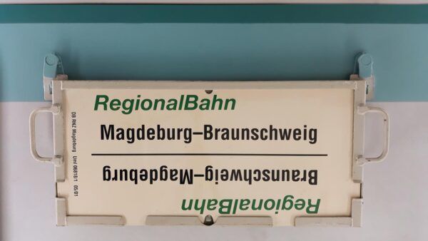 RB Braunschweig-Magdeburg Startseite Zuglaufschilder Nahverkehr RegionalBahn RB Braunschweig-Magdeburg Vorheriger Zuglaufschild RB Dessau-Halle Nächster Zuglaufschild RB Magdeburg-Braunschweig