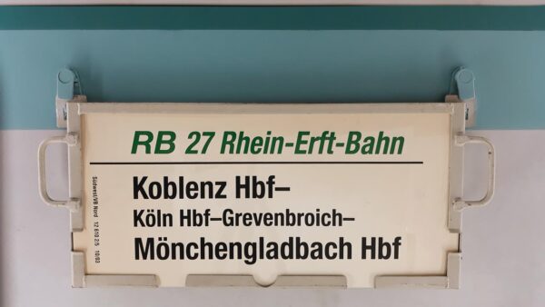 RB Jünkerath-Trier Hbf Startseite Zuglaufschilder Nahverkehr RegionalBahn RB Jünkerath-Trier Hbf Vorheriger Zuglaufschild RB 27 Rhein-Erft-Bahn Koblenz Hbf-Mönchengladbach Hbf Nächster Zuglaufschild RB Gerolstein-Jünkerath