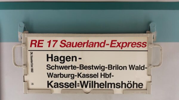 Vorheriger Zuglaufschild RE 17 Sauerland-Express Hagen-Kassel=Wilhelmshöhe