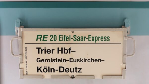 RE 20 Eifel-Saar-Express Köln-Deutz-Trier Hbf Startseite Zuglaufschilder Nahverkehr Regional Express RE 20 Eifel-Saar-Express Köln-Deutz-Trier Hbf Trier Hbf Bahnhofsplatz 1 54292 Trier Deutschland Vorheriger Zuglaufschild RB Dresden Grenzstraße-Dresden Nächster Zuglaufschild RE 20 Eifel-Saar-Express Trier Hbf-Köln-Deutz