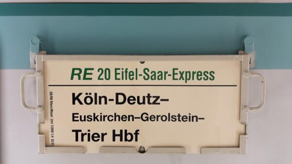 RE 20 Eifel-Saar-Express Trier Hbf-Köln-Deutz Startseite Zuglaufschilder Nahverkehr Regional Express RE 20 Eifel-Saar-Express Trier Hbf-Köln-Deutz Vorheriger Zuglaufschild RE 20 Eifel-Saar-Express Köln-Deutz-Trier Hbf Nächster Zuglaufschild Cochem-Koblenz