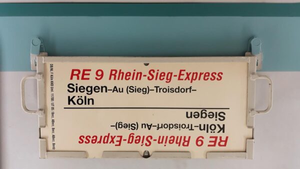 RE 9 Rhein-Sieg-Express Krefeld-Düsseldorf Startseite Zuglaufschilder Nahverkehr Regional Express RE 9 Rhein-Sieg-Express Krefeld-Düsseldorf Vorheriger Zuglaufschild RE 9 Rhein-Sieg Express Siegen-Köln Nächster Zuglaufschild FD 723 Berchtesgadener Land Dortmund-Berchtesgaden