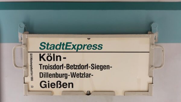 SE Mönchengladbach-Gießen Startseite Zuglaufschilder Nahverkehr StadtExpress SE Mönchengladbach-Gießen Vorheriger Zuglaufschild SE Mönchengladbach-Siegen Nächster Zuglaufschild SE Köln-Gießen