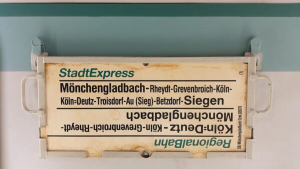 SE Mönchengladbach-Siegen Startseite Zuglaufschilder Nahverkehr StadtExpress SE Mönchengladbach-Siegen Vorheriger Zuglaufschild SE Siegen-Köln Nächster Zuglaufschild SE Mönchengladbach-Siegen
