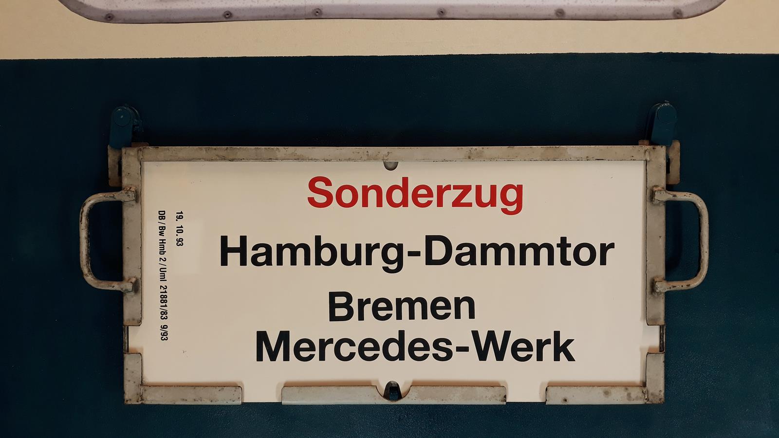 Dieses Zuglaufschild wurde nur für eine Fahrt am 19.10.1993 gedruckt.Das Mercedes-Benz Werk Bremen startete 1978 mit dem T-Modell der Baureihe 123 die Pkw-Fertigung. Mit rund 11.000 Mitarbeiterinnen und Mitarbeitern ist das Werk der größte private Arbeitgeber der Region. Am Standort wurden inzwischen mehr als 10 Millionen Fahrzeuge produziert. Plug-in-Hybride und Elektrofahrzeuge sind dabei seit mehreren Jahren fester Bestandteil des Produktportfolios.