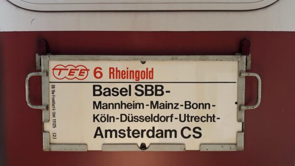TEE 6 Rheingold stellt bei diesem Schild das Bundesbahn Betriebswerk Basel -Dieser Waggon endete bereits in Emmerich, dem letzten Halt vor der Einfahrt in die Niederlande. Im Juli1985 Rheingold erreicht um 19.01 Uhr und verlässt den Bahnhof Emmerich um 19.11 Uhr in Richtung Amsterdam CS