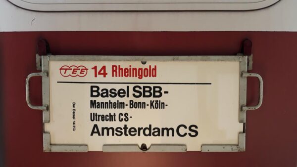 TEE 6 Rheingold fährt hier von Milano C / Mailand durch die Schweiz, Deutschland in die Niederlande. Der Waggon mit diesem Schild wurde vom Bundesbahn Bahn Betriebswerk Frankfurt Hauptbahnhof -abgekürzt Ffm gestellt. Dieses Schild war mal weißen Kunststoff gedruckt und wurde durch die Sonne immer cremiger…