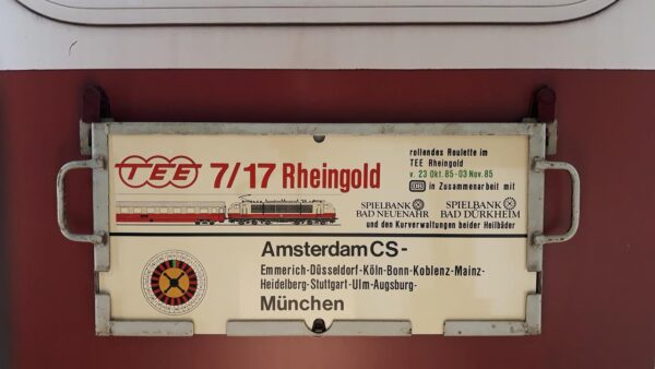 Am 2.Juni 1985 wurde der neue Flügelzug TEE 17 von Mainz nach Salzburg mit einer Eröffnungsfahrt in Betrieb genommen.Während der TEE 7 Rheingold 1985 von Amsterdam CS nach Basel SBB fuhr,startete der TEE 17 Rheingold, seine „Anschlussfahrt“erst ab Mainz. Auch dieses TEE-Zuglaufschild es TEE 16/17 Rheingold mit der Verbindung Mainz-Salzburg ist hier auf der Homepage zu sehen….