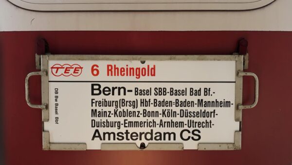 TEE 7 Rheingold Amsterdam CS-Bern Startseite Zuglaufschilder Fernverkehr Trans-Europ-Express TEE 7 Rheingold Amsterdam CS-Bern Das Betriebswerk Basel Betriebsbahnhof stellte 1984 diesen Zug. Vorheriger Zuglaufschild IC 1624 Weserbergland Köln-Munster Nächster Zuglaufschild TEE 6 Rheingold Bern-Amsterdam CS