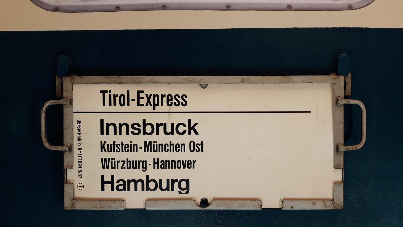 Tirol-Express Innsbruck-Hamburg Startseite Zuglaufschilder Fernverkehr D-Züge lange Strecke Tirol-Express Innsbruck-Hamburg Ungewöhnlich,das man bei dem Zuglaufschild auf den Zusatz“Altona“ verzichtet hat. Vorheriger Zuglaufschild EuroCity 7 Lötschberg Braunschweig-Basel Bad Bf Nächster Zuglaufschild Tirol-Express Innsbruck-Helsingør