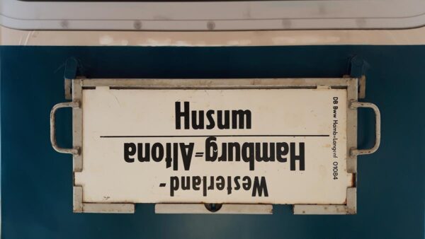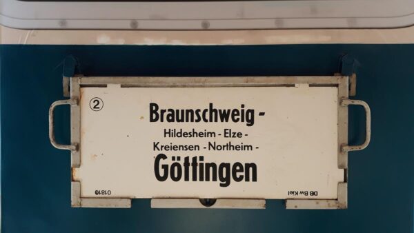Dieses Zuglaufschild ist noch aus Blech und hat erkennbar oben und unten nur Reiternasen,die es in der Blechtasche halten.